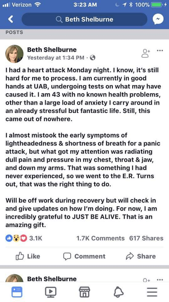 Though I was already plenty motivated, during the delay between Sunday and today, a local news person, who is quite thin and only 43 years old, with no known risk factors for cardiovascular disease, posted this on her Facebook page: