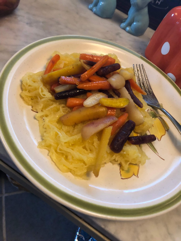I enjoyed everything – but the rainbow baby carrots (sale alert – $4 for 2 bags of organic at Publix!) and spaghetti squash were ahhhmazing. So stinkin’ good!