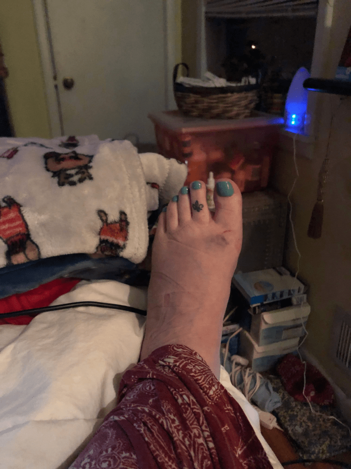 I suddenly developed this odd bruise with no injury and all the CRPS pain in my left foot plus the odd taste buds and the headaches and the allergies. Good times.