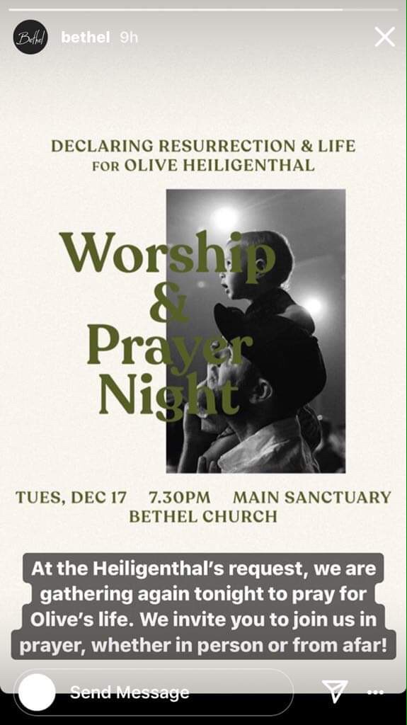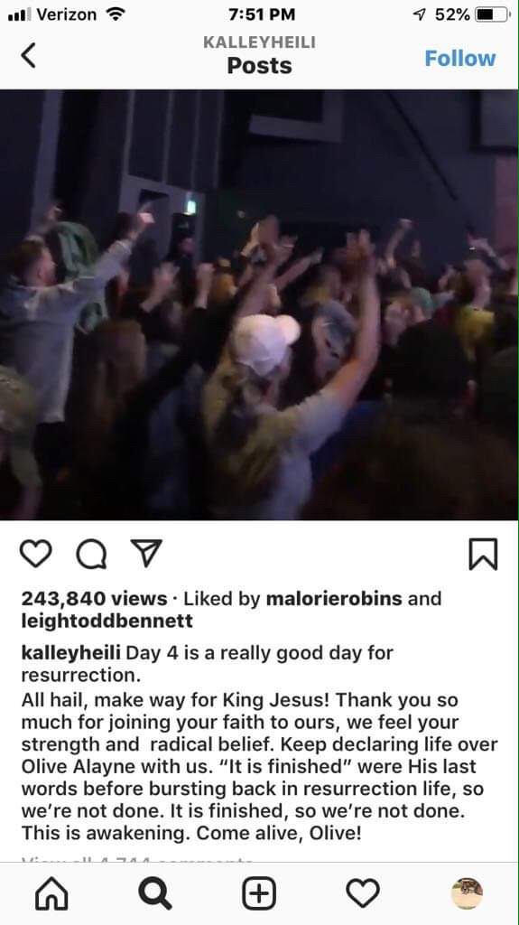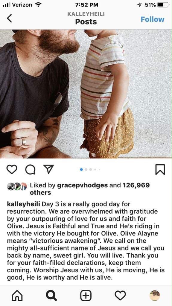 On Sunday, I was scrolling through Instagram and saw a repost from Bethel by a popular Christian artist, reporting the tragic news that the two year old daughter of one of the worship leaders of Bethel Music, Kalley Heiligenthal, had died suddenly during the night seemingly Saturday and asking everyone to pray for RESURRECTION of this precious child, Olive.