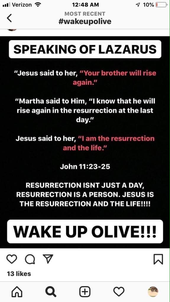 And #wakeupolive hashtag is everywhere and scripture is ripped out of context and these people are literally posting things like “if Jesus was resurrected, why not Olive?”