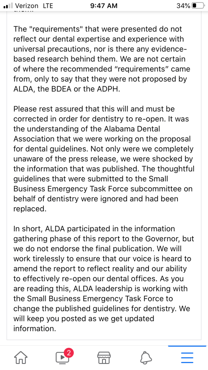Then, this morning, I learned that the Lt. Governor’s “Task Force” was blatantly dishonest and changed the recommendations and plans of the Alabama Dental Association – who have plainly stated they are NOT ready to safely reopen – in their press release to the public: