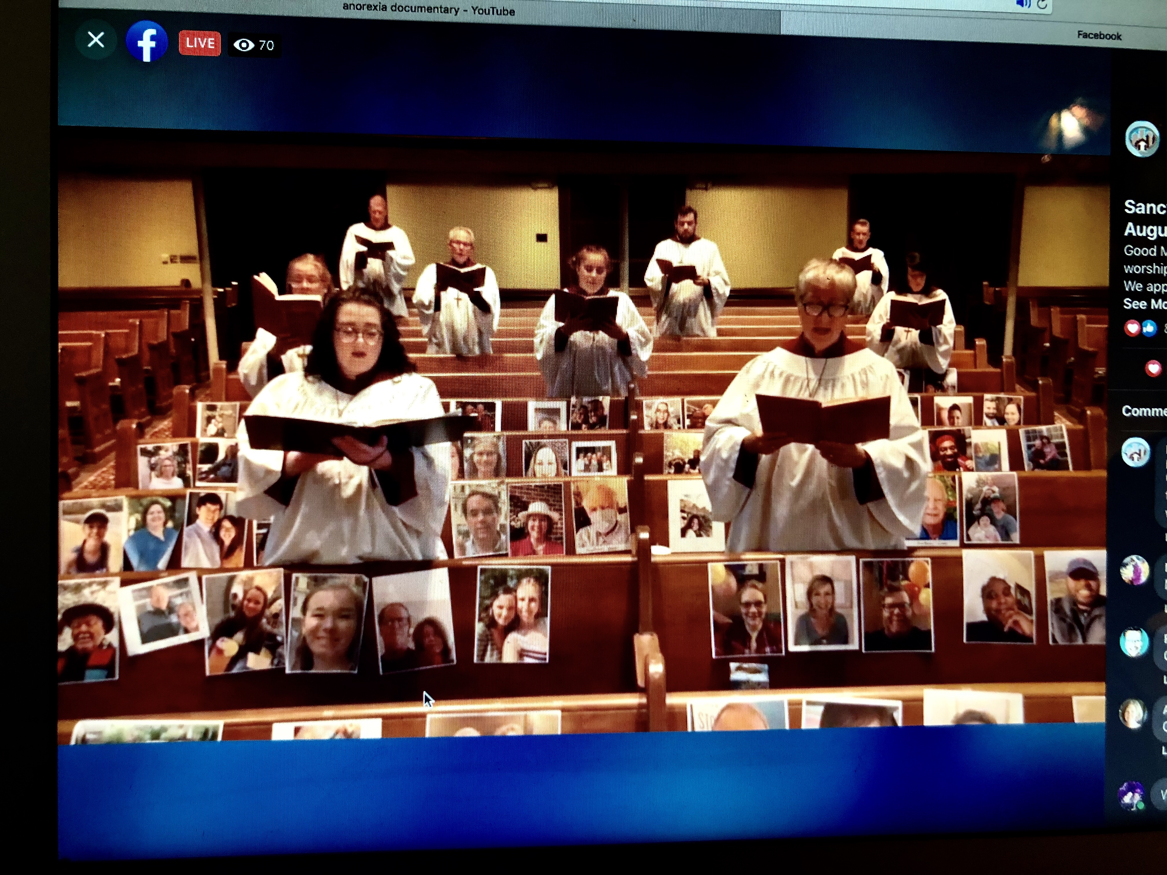 Our wonderful church has done everything it can to make virtual church as “home-y” as possible, including this: