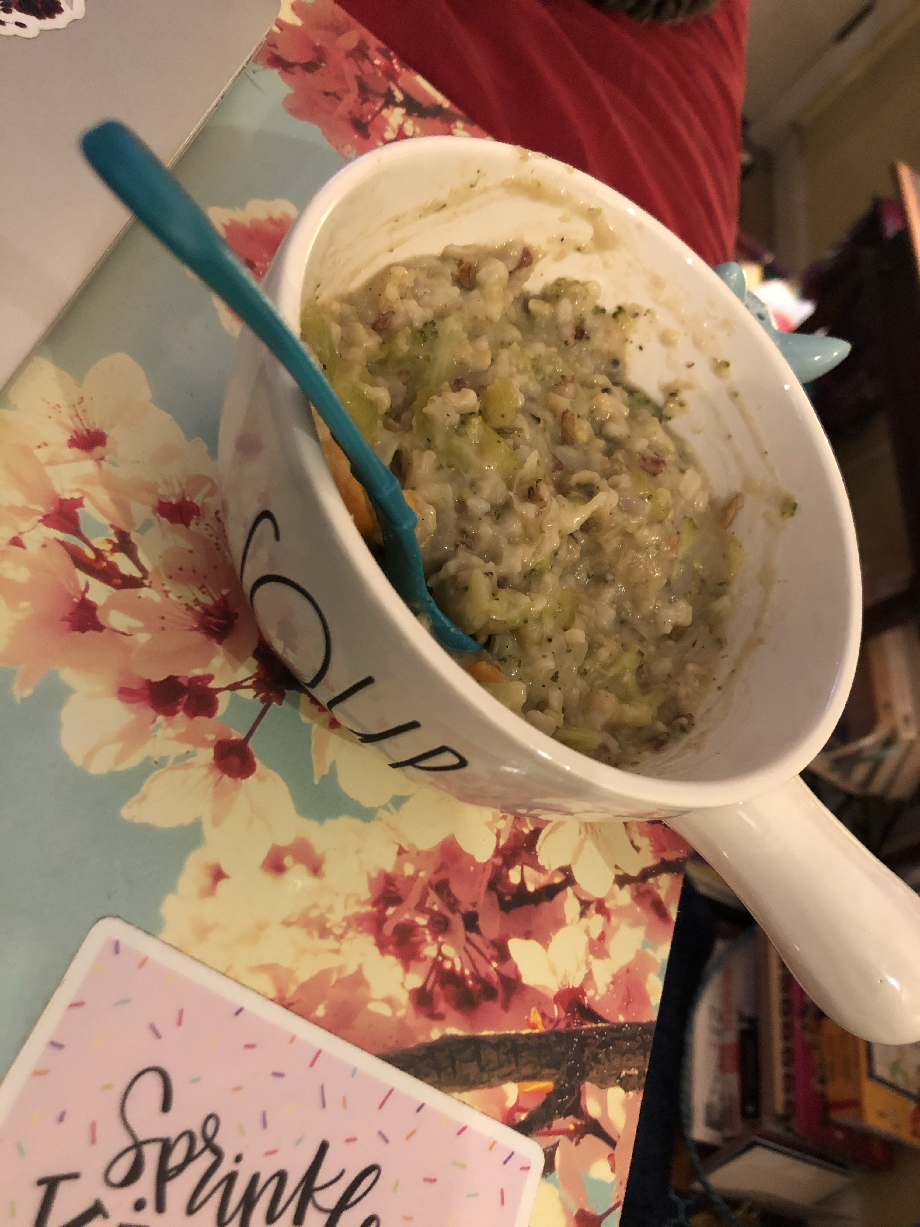 My precious Sara Bug made us the most yummy vegan creamy broccoli casserole for dinner as I was crazy hungry but my throat is still super sensitive from the endoscopy.