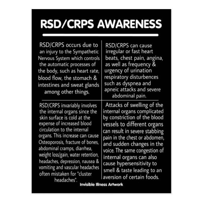 An aside: when I write about my CRPS, I feel led to post a quick refresher on what it is as it is so unusual. These graphics are just a few basics. I have severe CRPS with organ involvement. Unfortunately, that has brought dysautonomia with heart rate disregulation, the stabbing chest and abdominal pains, taste and smell aversions, headaches, sweats, anxiety, full body jolts, burning on the tops of my feet with ice cold pain on the bottom, assorted other random symptoms. . . just the whole bag of horrors.