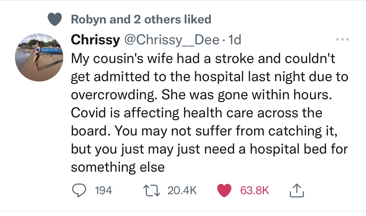 Here in my state, in a county that is less than an hour from my home, there was a country music festival that brought about 30,000 people the weekend of August 14th and 15th. At that time, the hospitals in our state were already in crisis with fewer than ten available ICU beds – for the whole damn state. That information did not cause anyone to rethink.
