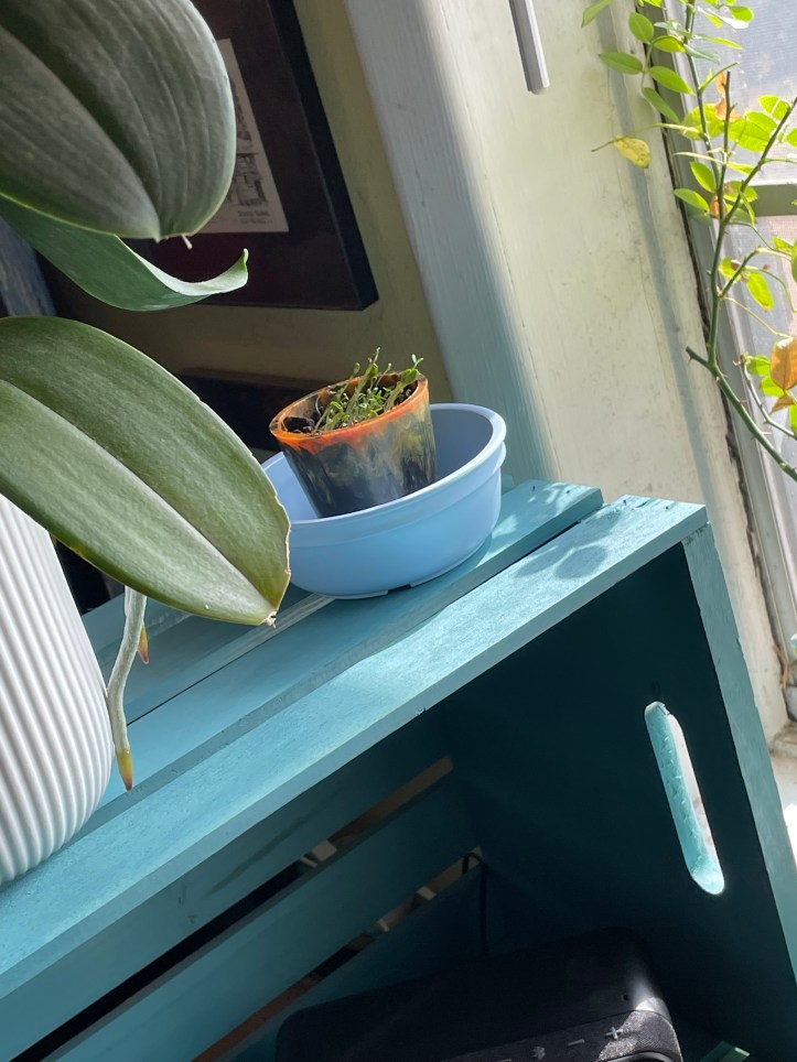 Since I hadn’t felt well that day, I actually ended up planting them at my little planting station on my porch in the middle of the night – my neighbors are totally used to this sort of thing and don’t even question it anymore I’m sure. bahaha. 🙂 – and then they actually spent the next two days away from direct sunlight because my husband was working on a fantastic project for me that required moving their shelf temporarily.