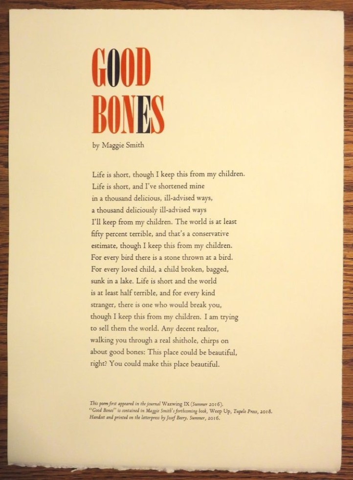 In the meantime, I am leaving my favorite Maggie Smith poem, Good Bones, as it has been on my mind so much these last several oh so shitty days.