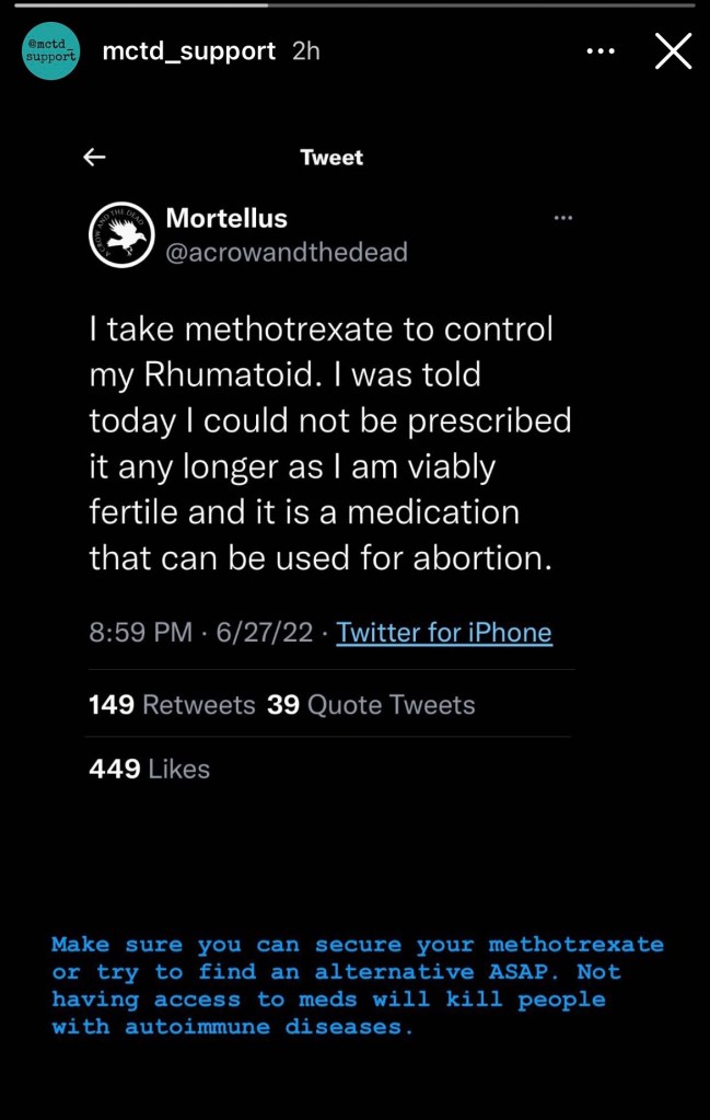 Here is an article explaining how some clinics are pulling patients off of methotrexate for fear of these laws and other patients have scripts that they can’t get pharmacies to fill: