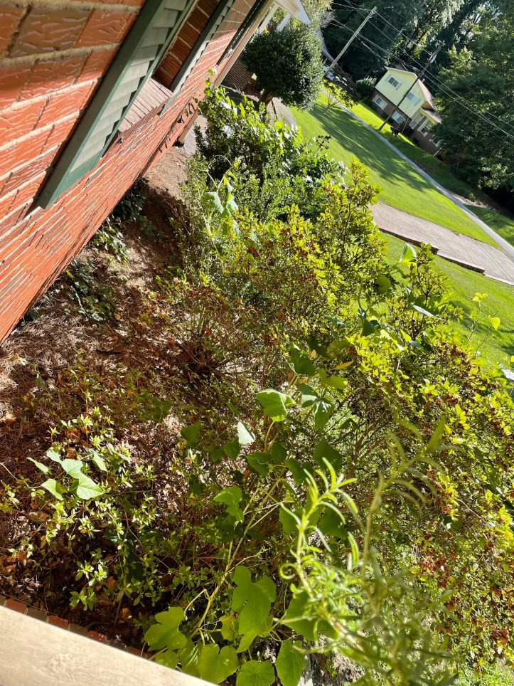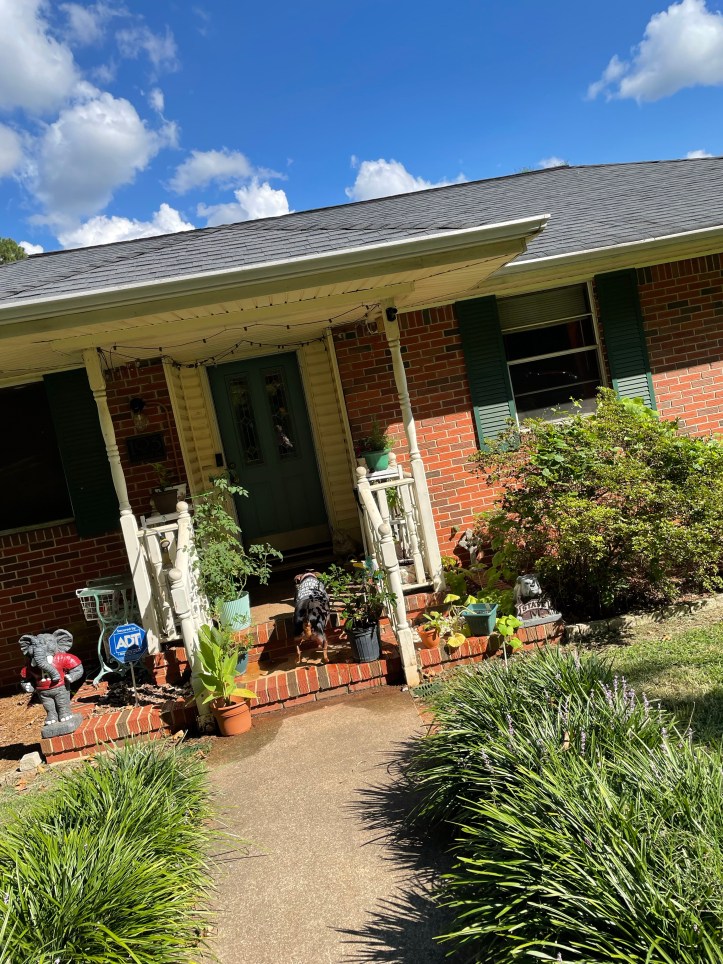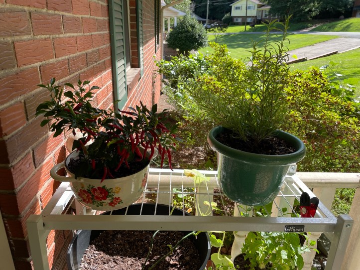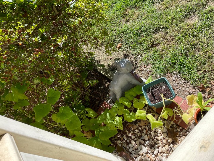 Around the same time, Sara wanted a singular cucumber plant – in a pot – and it is on the bricks at the base of the right side of the porch. . . oh yes, this is soon to be relevant. . .