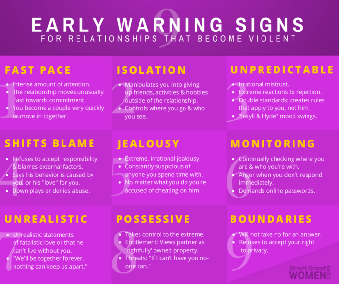 First, just for everyone’s consideration and awareness, here are some of the early warning signs of a potential domestic violence situation. Especially for young women, these red flags should really be considered closely in a relationship.