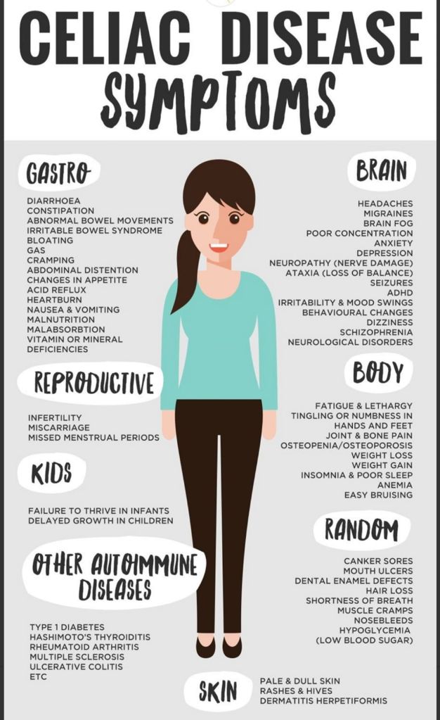 In my case, I had symptoms I did not realize were celiac disease for many years – GI issues and whatnot – but would be diagnosed when I became profoundly anemic due to a GI bleed as a result of my illness.