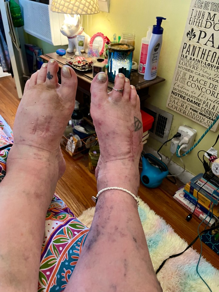 I woke up Saturday morning – literally four hours late – to some really pronounced body pain and stiffness – with my feet looking like this: