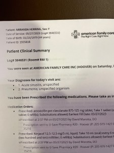Concerned, I went to urgent care and explained everything to the very kind doctor who assessed me and diagnosed sinusitis immediately (my chronic state of being), ran a COVID test (negative, thank the Lord), and then ran a chest X-Ray – but I honestly think he was expecting it to be okay, for me to have bronchitis and to give me shots and send me on.