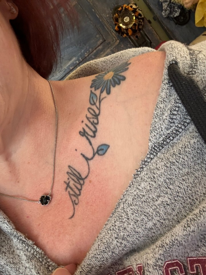 I’ve shared in a previous post that, when I was very young, I even had her Inaugural Poem pinned on my bedroom wall, clipped from the local newspaper the day after she read it at President Clinton’s inauguration – and I have some of her beloved words forever across my shoulder as well.