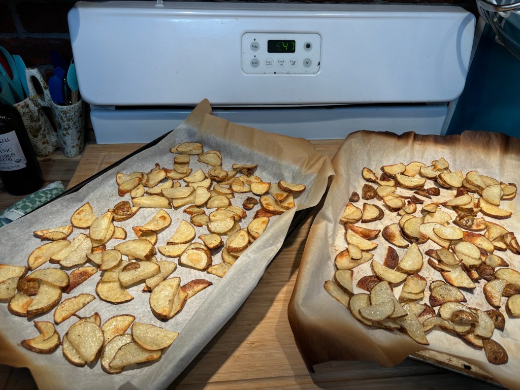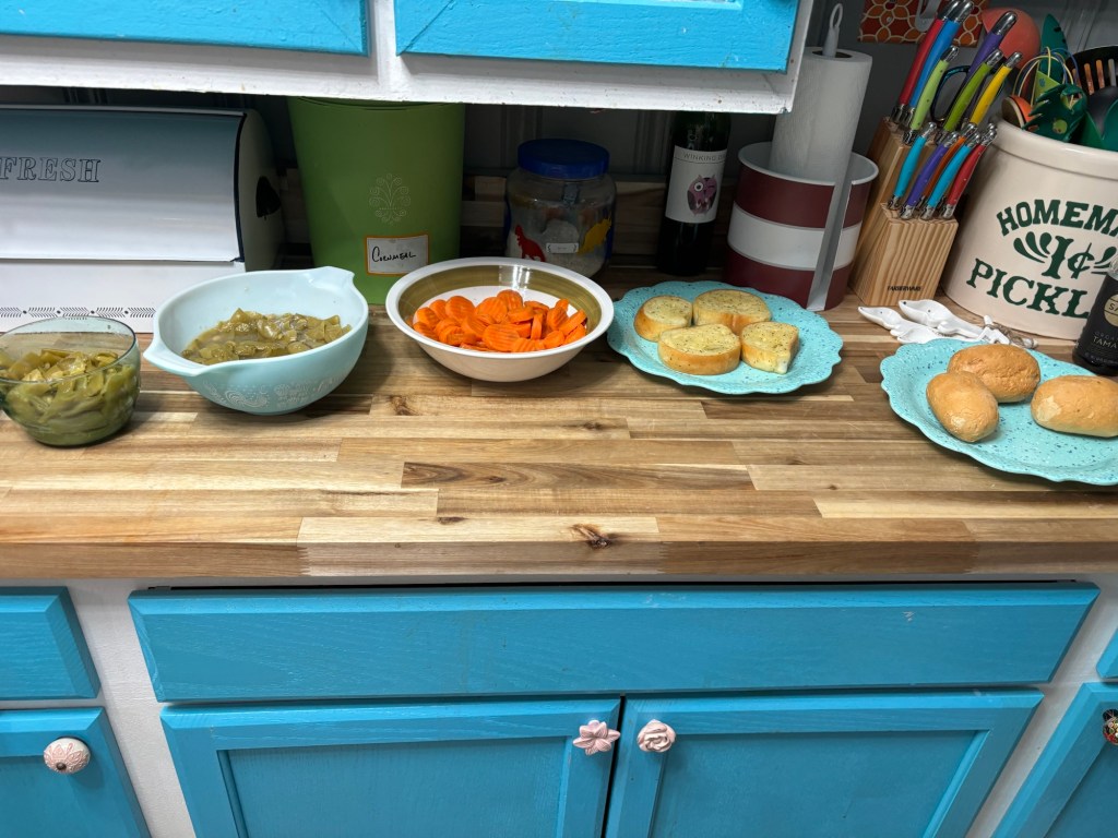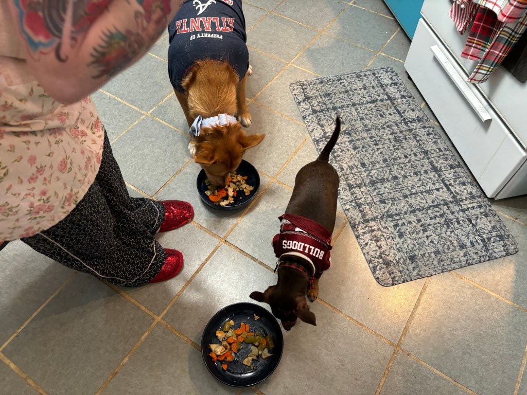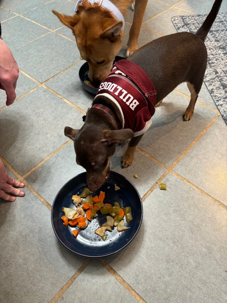 Indoors, we had a simple veggie dinner – and gave Ollie and Teddy their first veggie dinners too.