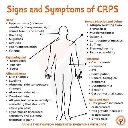 Second, as I’ve shared in the post above and written often, in addition to severe pain, CRPS can manifest in many ways: