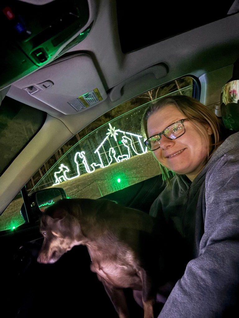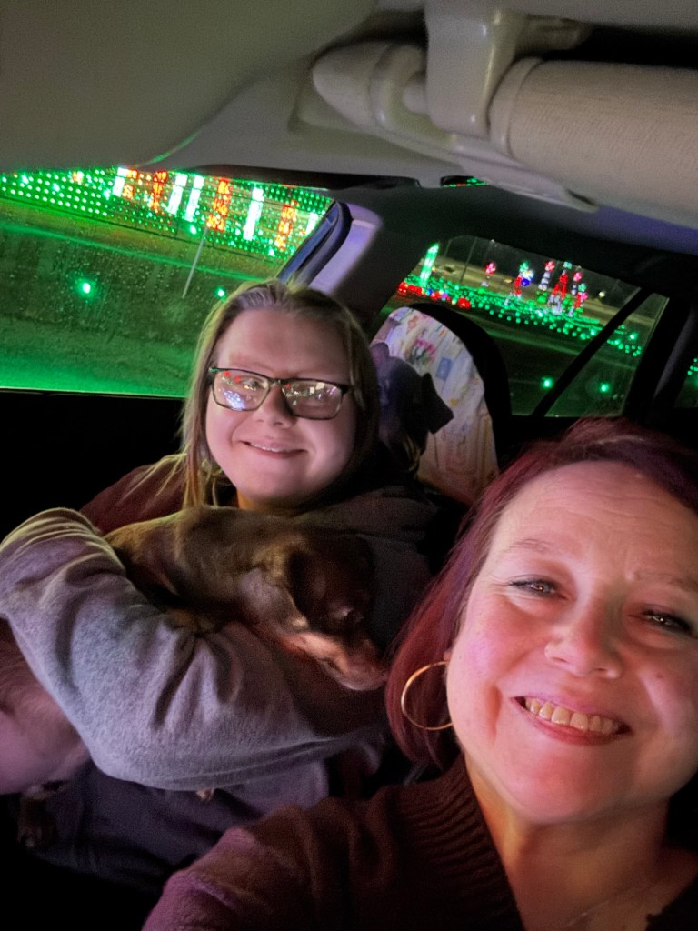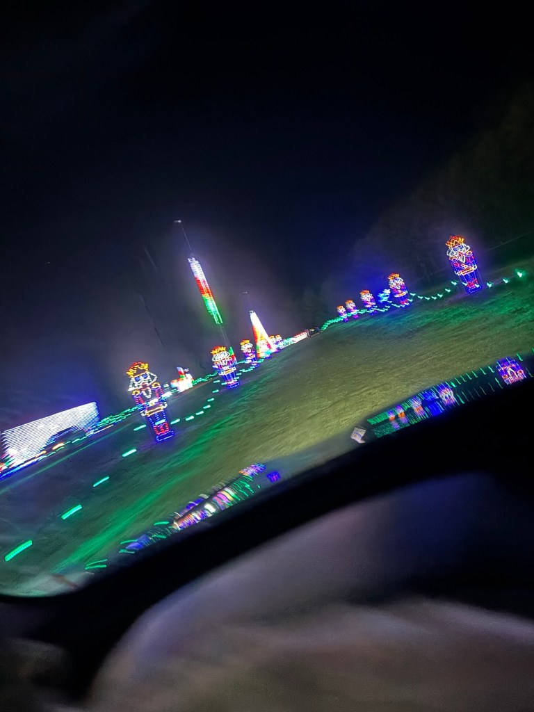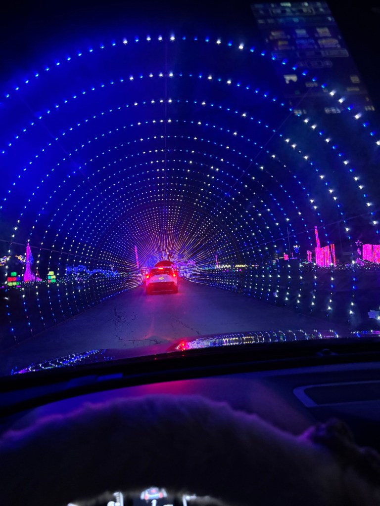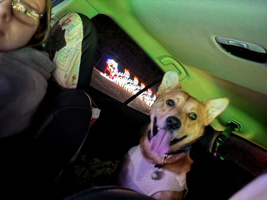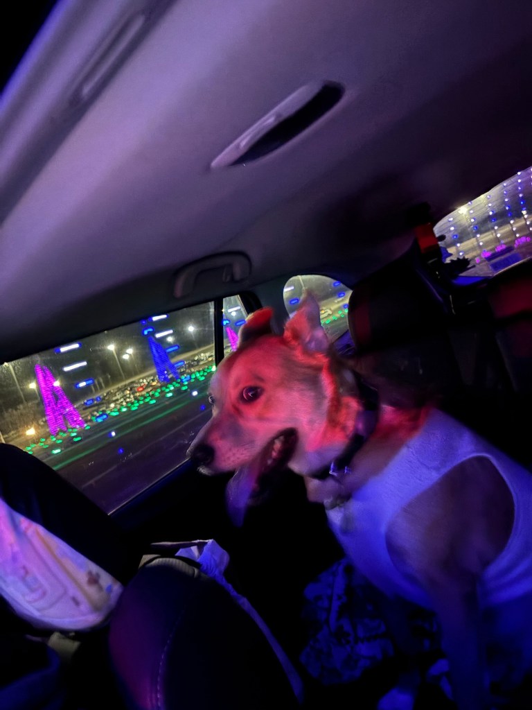 In addition to presents, Bug and I took Ollie and Teddy on a Christmas adventure to the Birmingham Race Course Drive-Thru Christmas Light and Music show. They really loved it.